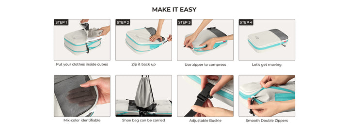 The 43L Roller Backpack moves smoothly through terminals and tight corners, while the 6PCS Compression Cubes keep every outfit in perfect order. Together, they turn packing chaos into calm and travel days into freedom. Pack smarter, roll easier, and get wherever you’re going — without ever checking a bag.