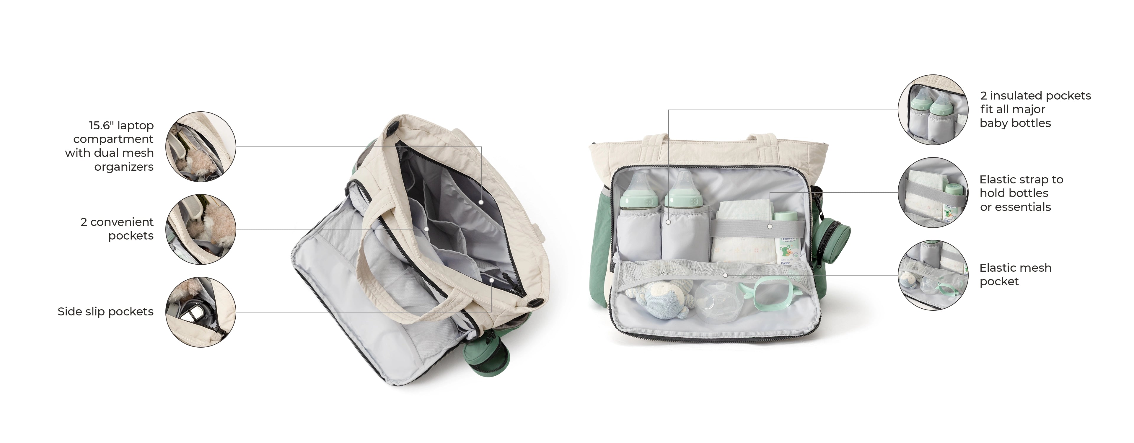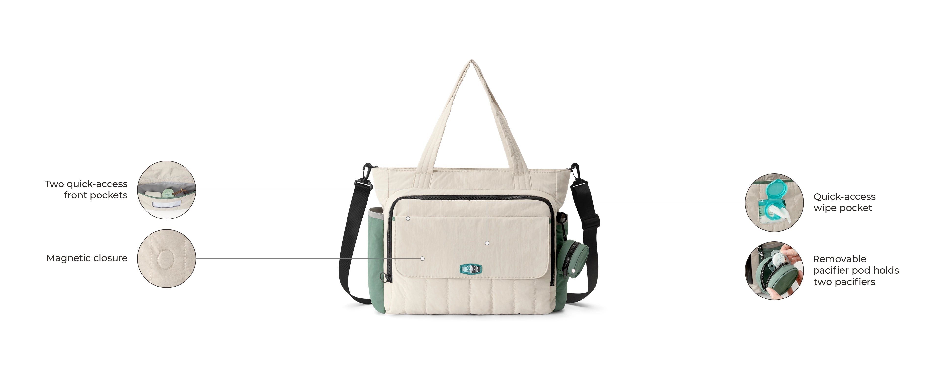 • Includes changing pad, pacifier pouch, and insulated bottle pockets
