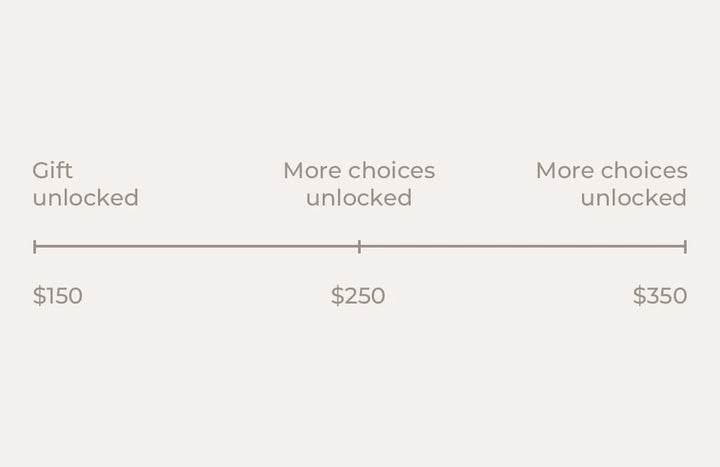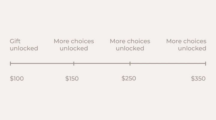Spend $100 to get a free gift, $150 to unlock an upgraded one, hit $250 for an even better gift, or reach $350 for our premium gift – all for $0.