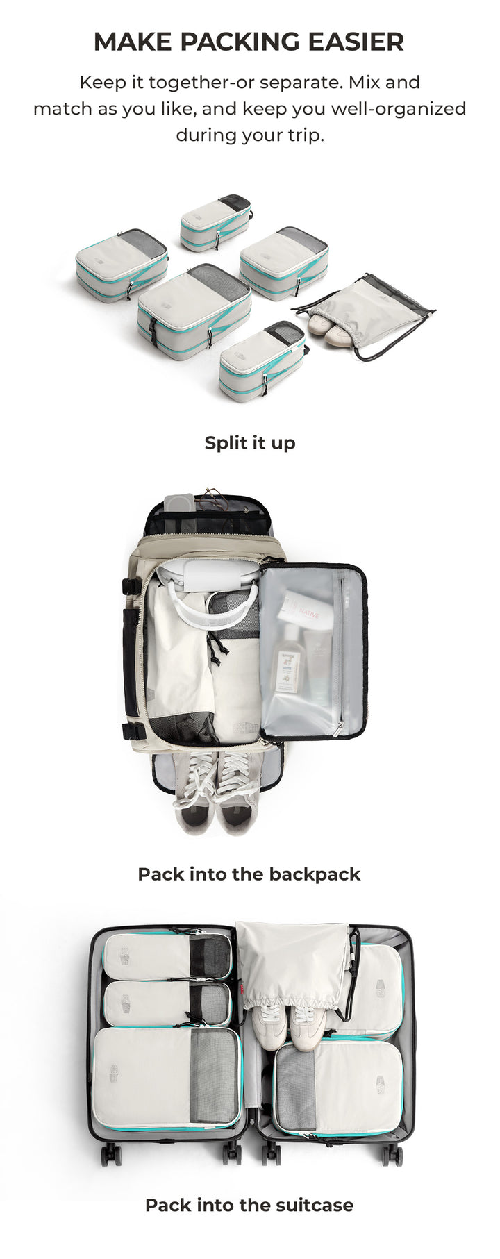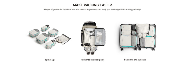 Streamline your travels with our space-saving Blast Packing Cubes. They're designed to compress, organize, and keep essentials in check so you can pack right and travel light.