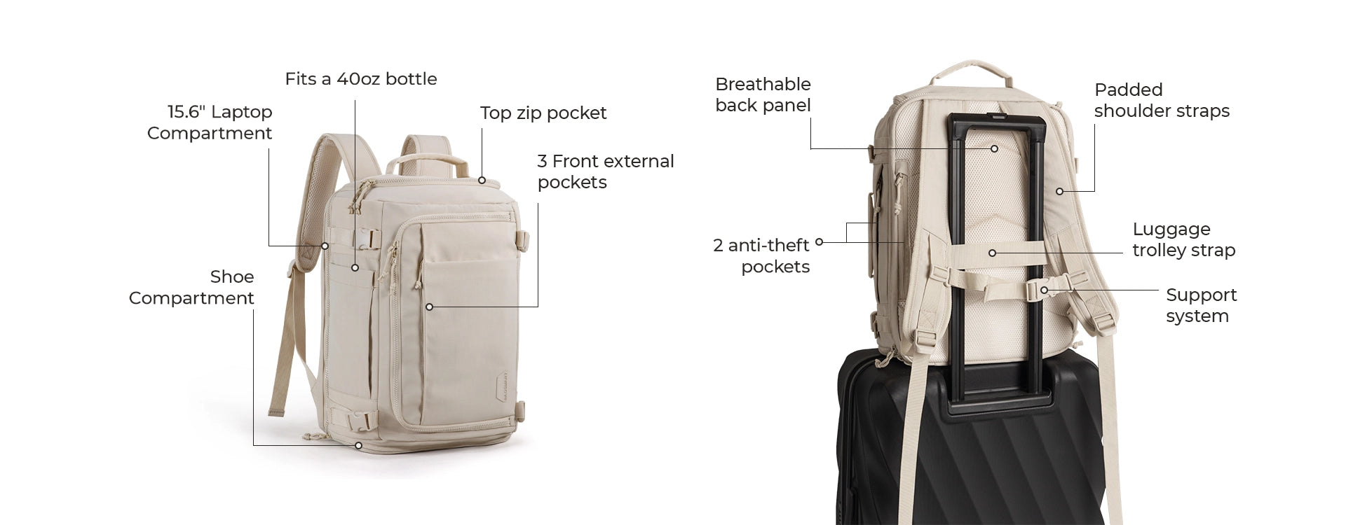 Laptop Compartment: Fits a 15.6-inch laptop in the main pocket, and a smaller pocket for items like iPad, Kindle, or Nintendo Switch.