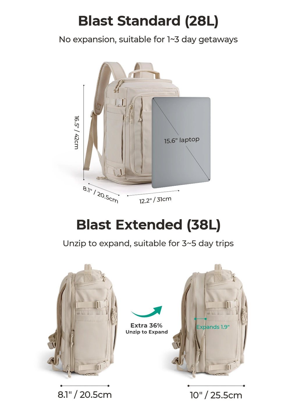 Featuring a spacious main compartment with a wide opening, making clothing packing like a breeze. The Blast Travel Backpack equipped with a 180-degree laptop compartment for seamless security checks. 6 independent pockets for additional dedicated space, ensuring less clutter and more organization.