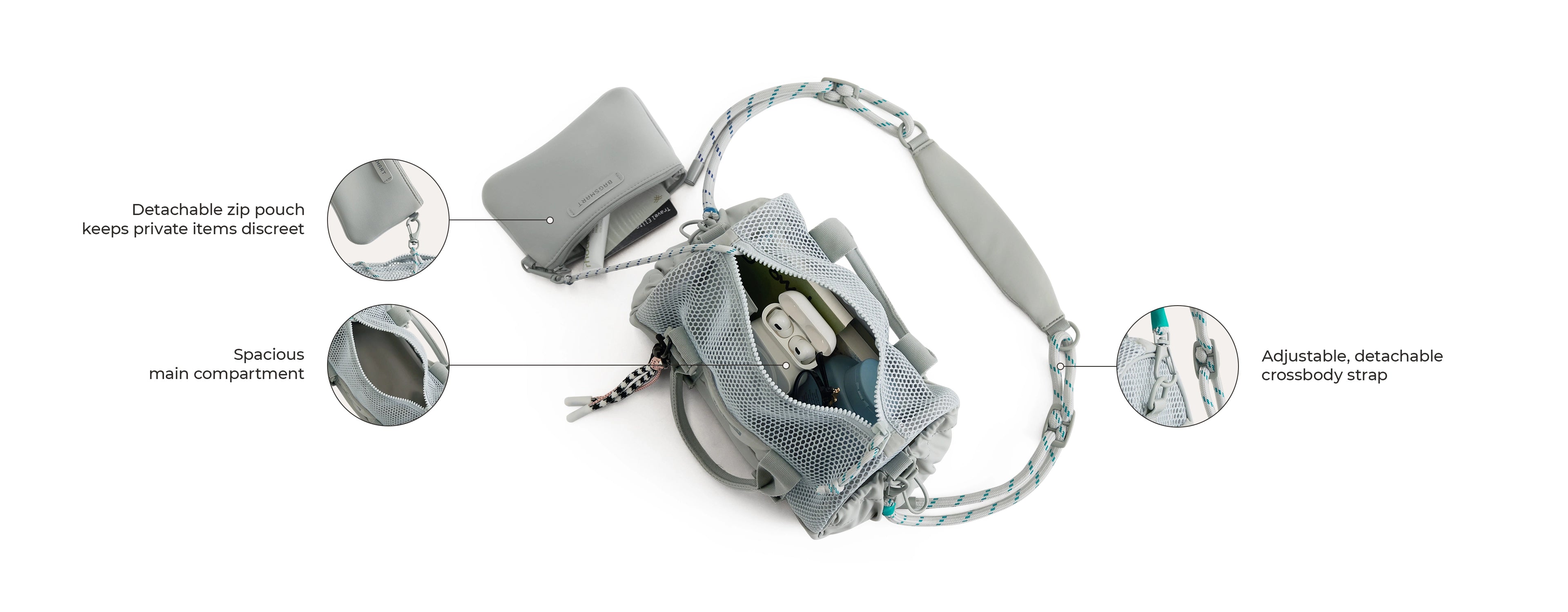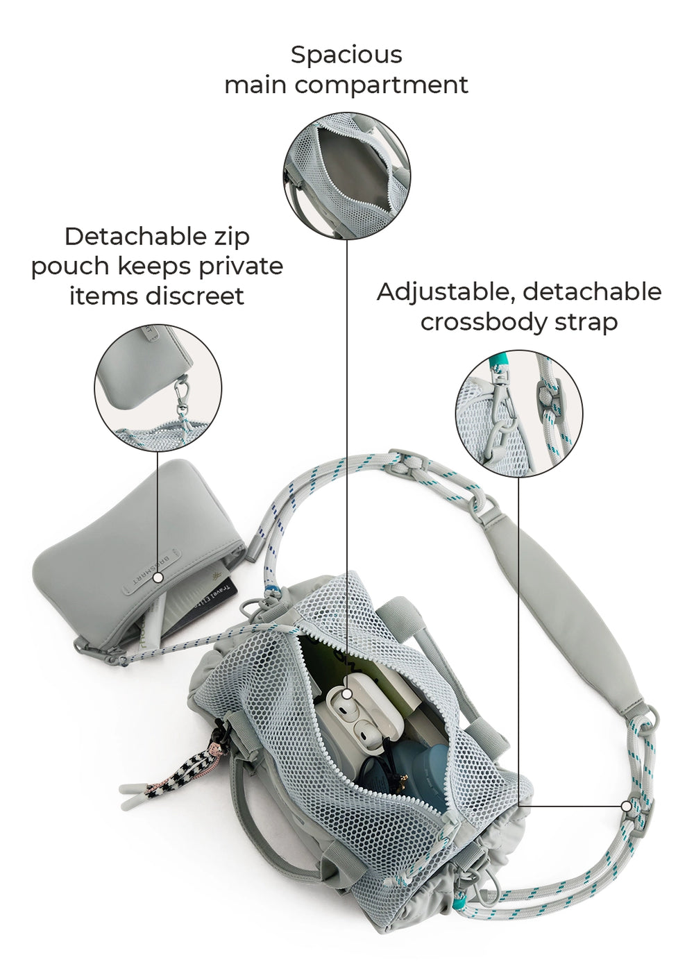 Proof that a gym bag can pull double duty as your cutest accessory. The REIKI Mesh Mini Duffle shows off your essentials in all the right ways—mesh, compact, and built for movement. Whether you’re headed to hot yoga or a hot girl walk, this bag keeps your style visible and your gear ready, with bottom straps for your mat and bonus charm points (literally).